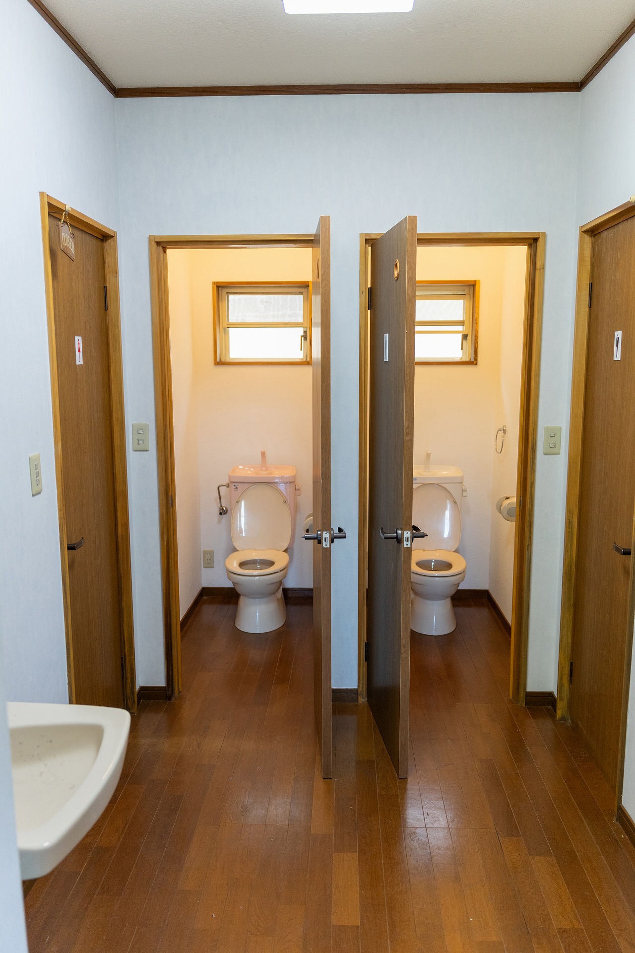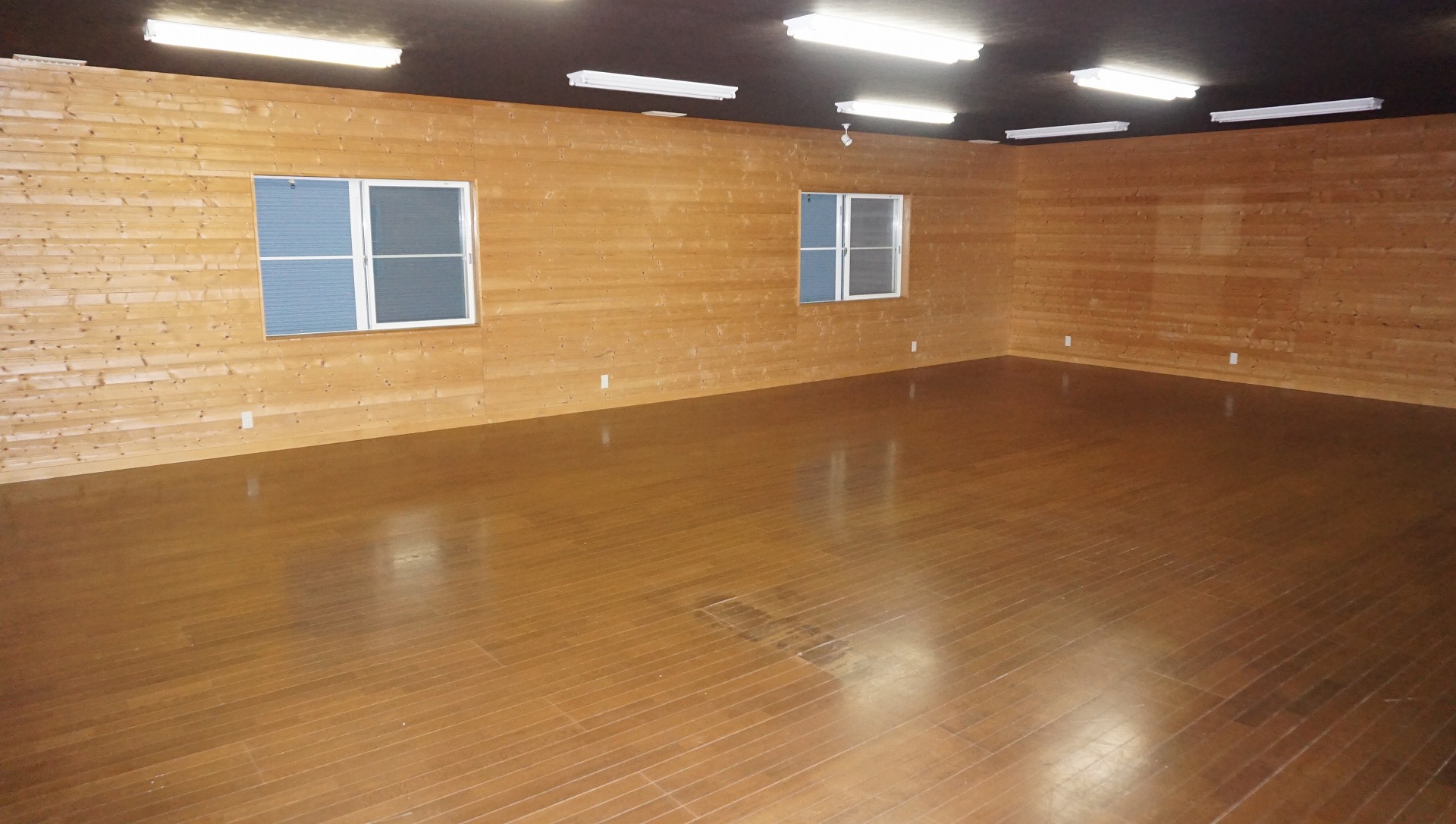 間取りはというと、印象的なのが収容人数30人ほどの大きな1部屋があるほか、物置スペースと、キッチン、トイレ2個、シャワールーム2個があるシンプルな建物です。この建物、以前は集会場として利用されていたそうで、住むには間取りを変えた方が住みやすくなると思います。家族の人数やお仕事のワーキングスペースなどご自身で間取りを考えることができるので変幻自在の建物ではないでしょうか。もちろん引き続き集会場としても活用できますし、床などの状態が良いので体操教室としても利用できるのでは・・・。