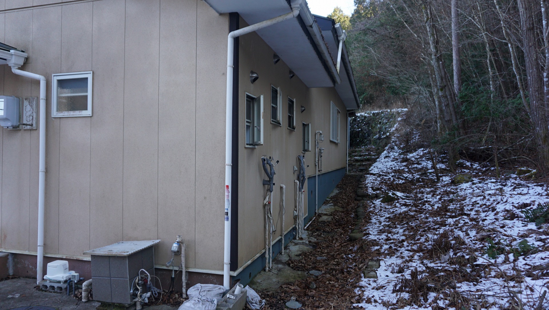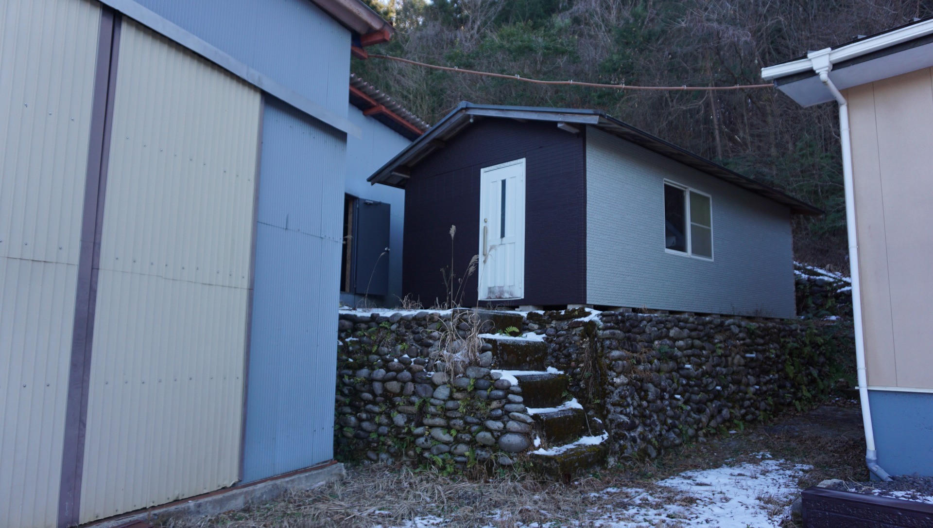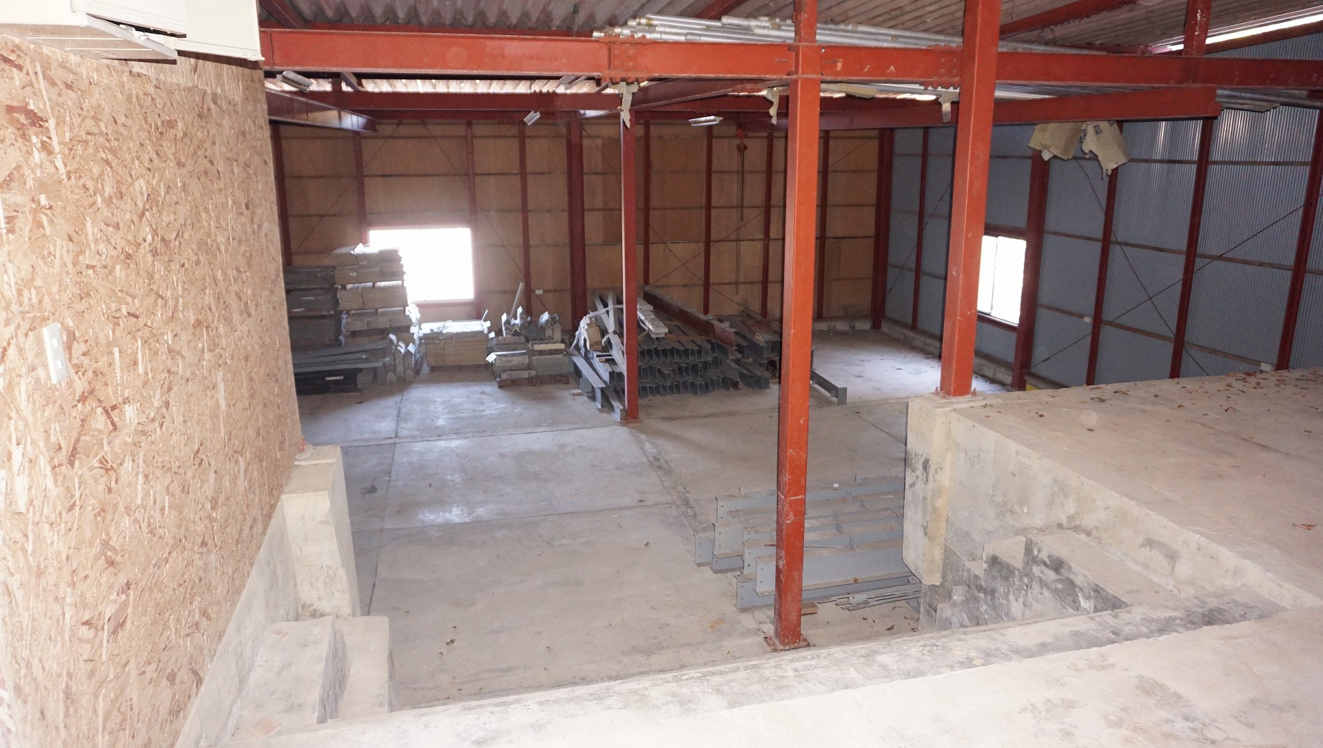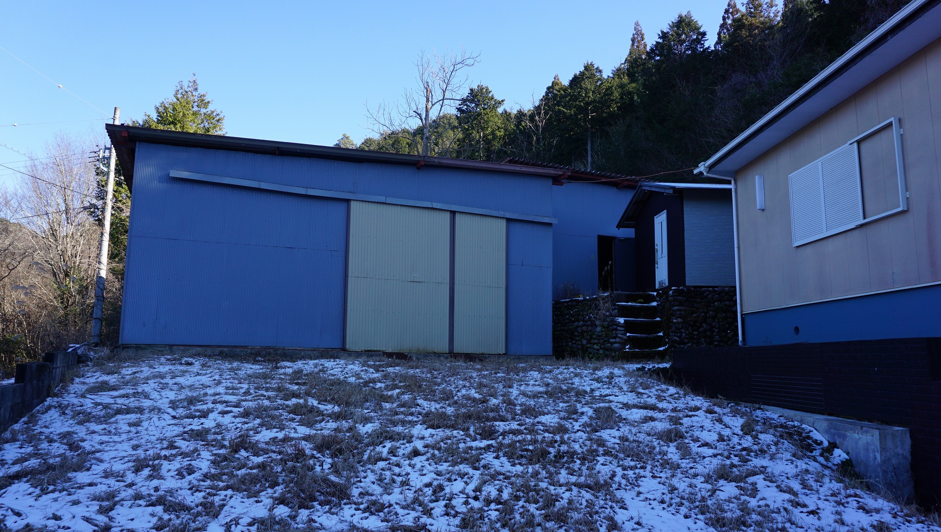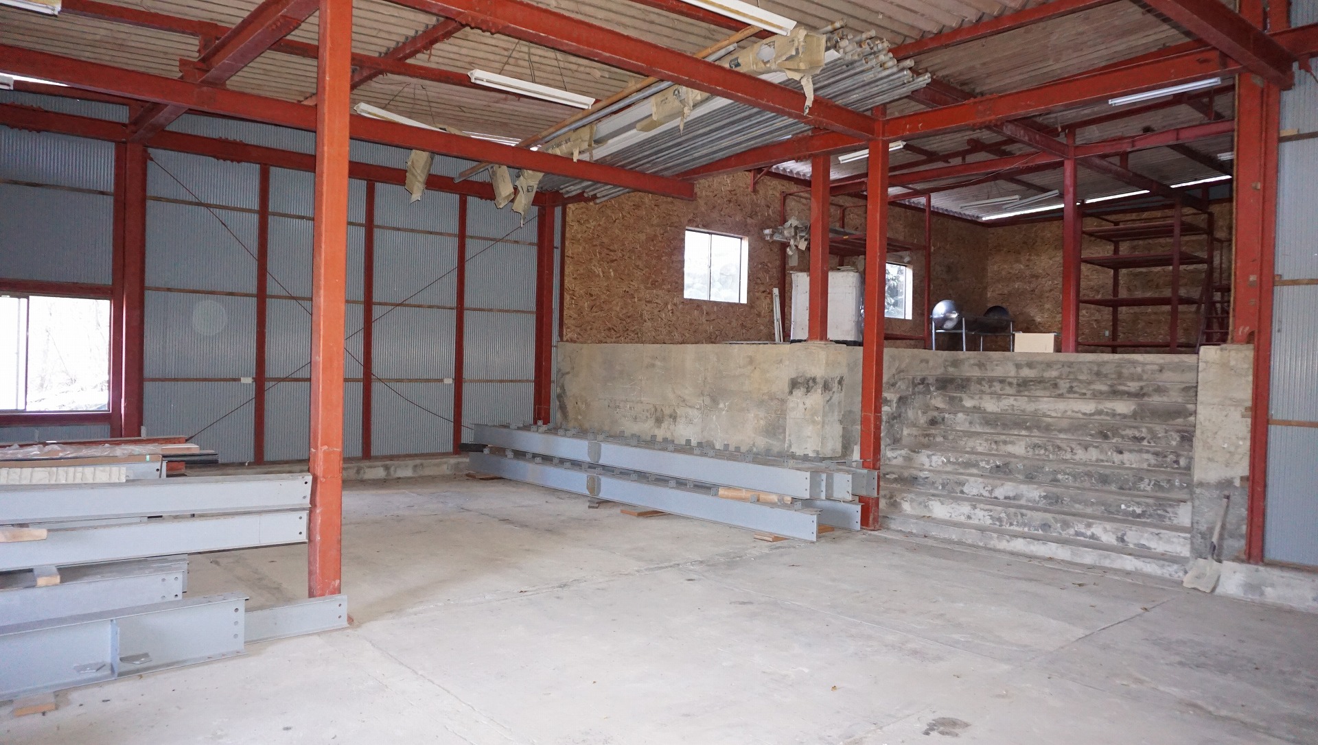 奥に見えるのが付属の建物ですが、こちらも大きな作業所です。中も広いため、木材加工所、鉄工所、自動車整備、サバイバルゲーム、スケートパークなどなど夢が膨らむ建物であることは間違いなし!